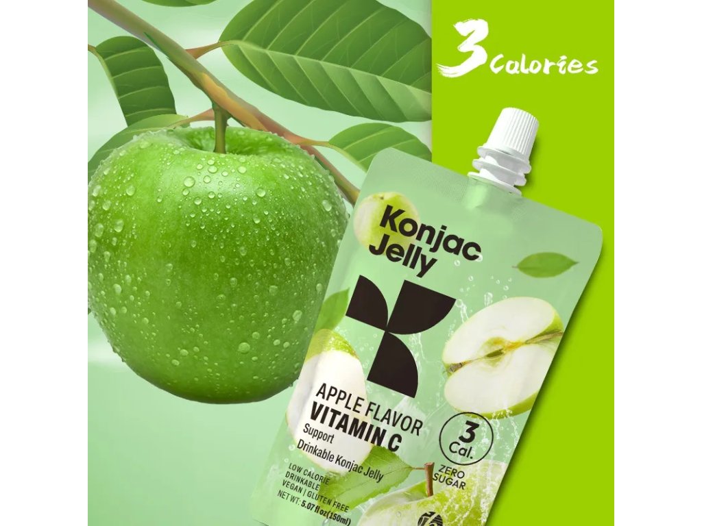 Pouze 7 kcal na balení! Sytící konjac želé s příchutí jablíčka, bez cukru, bohaté na vitamín C a kolagen. Pomáhá potlačovat chutě, podporuje hubnutí a krásnou pleť - ideální snack na cesty!