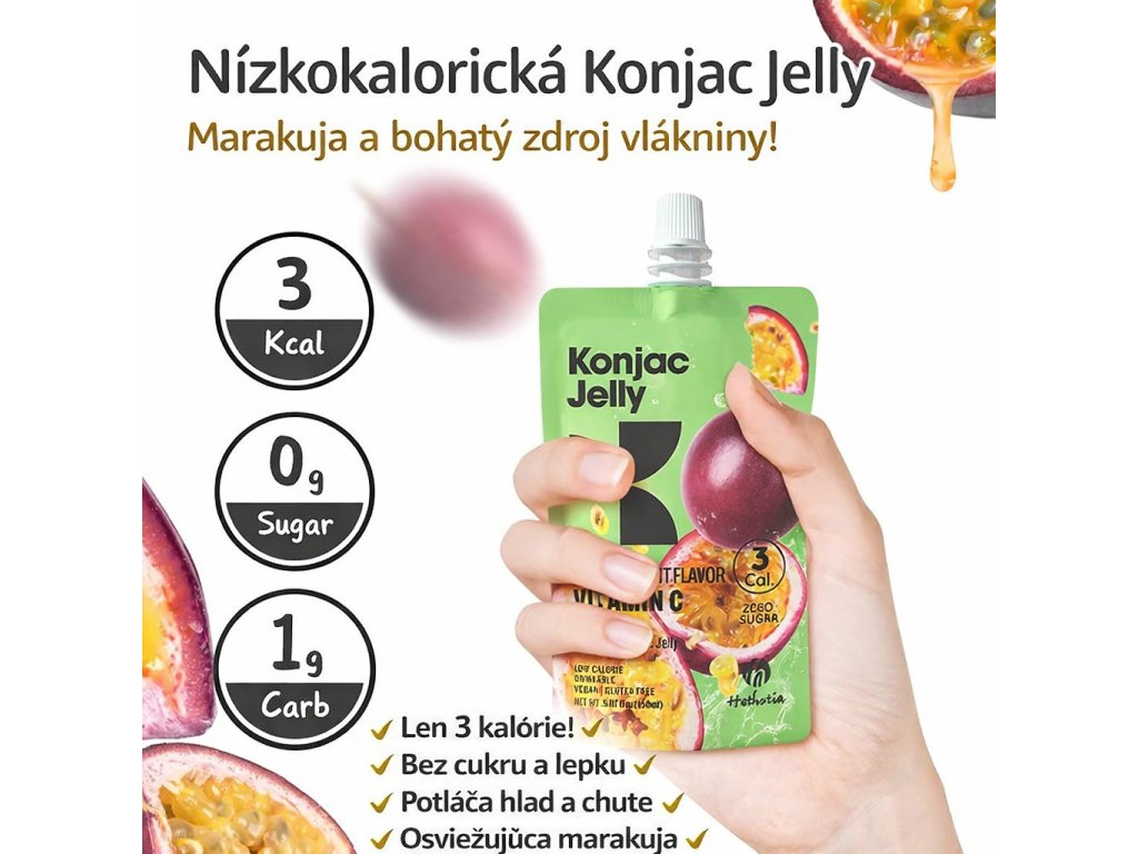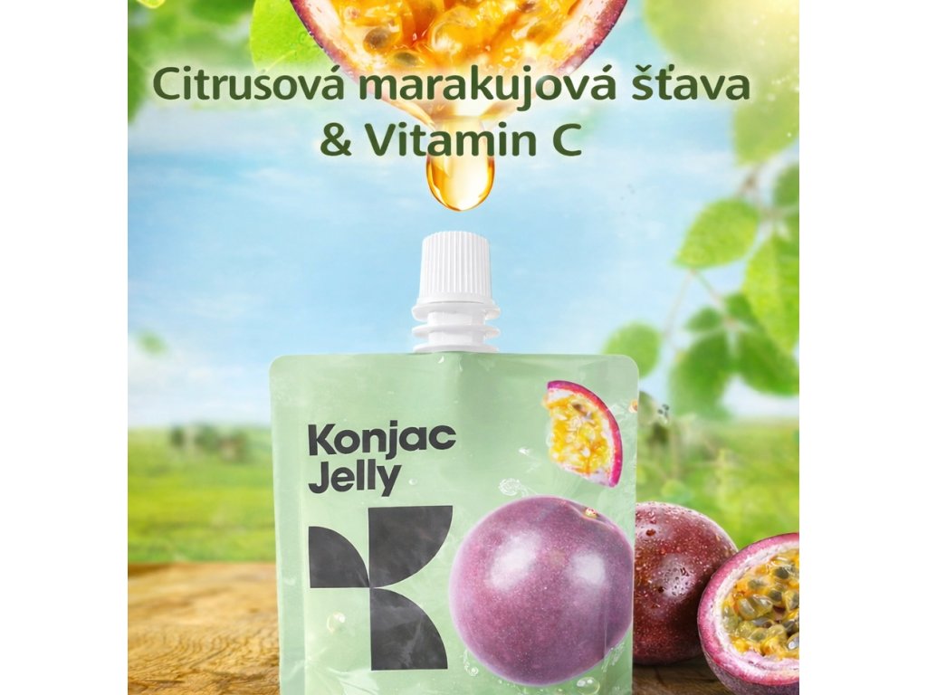 Konjac Jelly Marakuja je lehký, nízkokalorický dezert vyrobený z konjacové vlákniny (glucomannan), která pomáhá navodit pocit sytosti. Ideální pro diety, redukci hmotnosti, low-carb a zdravý životní styl.